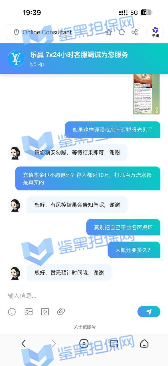 乐赢平台(ly.vip8)恶意锁号,赢钱了就直接给你扣上“违规套利”的帽子,从2025年12月底开始在这儿玩百家乐,一开始小赢几把还能正常提,账户冲到V4级,流水干到近300万。结果风水轮流转,好日子没几天,平台突以“套利”为由把号锁了。号还能登,但游戏全他妈禁了,动都动不了,拖了一个月后直接彻底锁死,账户里40多万就这么被平台不明不白扣光,这平台就是个黑吃黑的垃圾坑,赢钱就跑路,输钱倒是欢迎。
