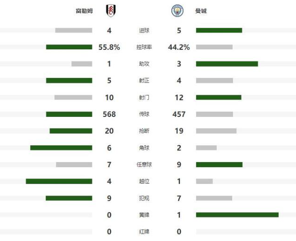 第54分钟杀疯了的曼城,再次攻破富勒姆的球门,表现活跃的多库,前场抢断后带球内切,随后起脚兜射远角建功,比分被进一步拉大到了5-1,虽然富勒姆没有放弃,靠着伊沃比的进球,丘库埃泽的梅开二度连入3球,帮助富勒姆将比分追至4-5,但无力改变主场输球的结局。