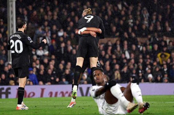 比赛正式开打后,曼城就大举压上围攻富勒姆,第6分钟哈兰德就差点帮助球队取得梦幻开局,可惜低射击中立柱被弹出,不过第17分钟,挪威魔人还是接到多库左路传中后,禁区内扫射破门,帮助曼城取得了1-0的领先,凭借此球哈兰德只用了111场英超比赛就打进了100粒进球,创造了英超历史最快百球纪录。