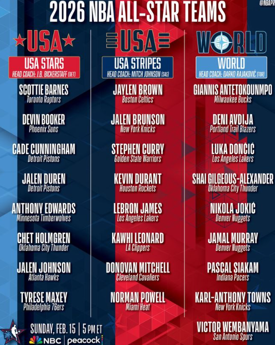 北京时间2月4日,2026年全明星赛的分队结果出炉,两支美国队和一支世界队的阵容揭晓。詹姆斯联手杜兰特库里,约基奇领衔世界队8人豪阵。字母哥因伤预计不会出战全明星赛,莱昂纳德递补入选,唐斯为世界队出战。