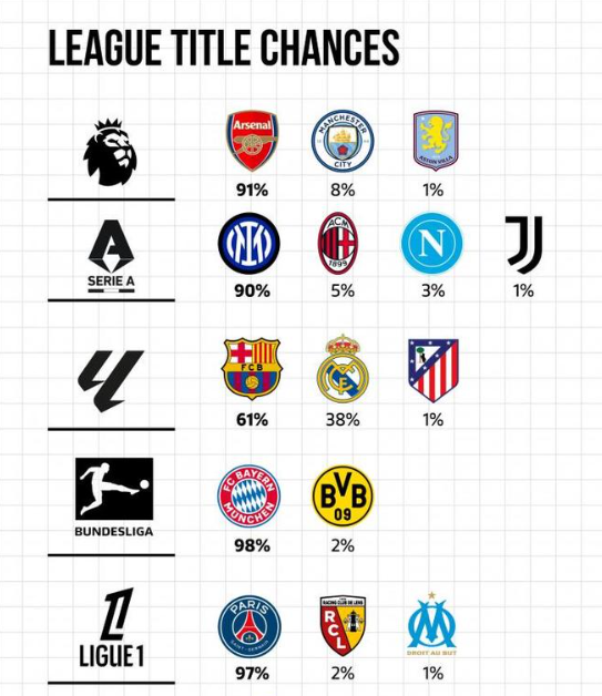 虽然本赛季还有十几轮才会结束,不过,在五大联赛的对比各领跑者的姿态是越发的明确了。就此,数据机构EuroClubIndex也是给出了预测,就五大联赛夺取奖杯的几率给出计算。